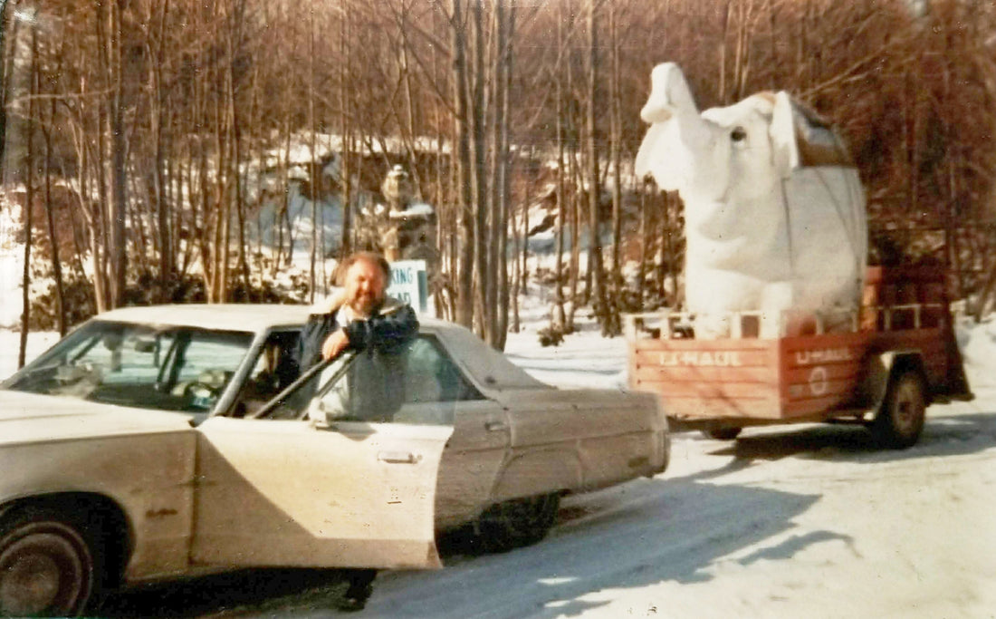 Meet our girl, Miss Ellie Phant! If you stand close, she might even talk to you. Mister Ed brought this life-sized, 500-pound elephant with moving ears and eyes from an antique store in Mason, Ohio. Miss Ellie used to sit at King’s Island Amusement Park in Cincinnati as part of a safari adventure. It was love at first sight. As soon as she blinked her eyes and wiggled her ears, Mister Ed fell in love. When he saw her and how big she was, he said “Oh my heaven, I’ve always wanted an elephant that size.” She weighs more than 500 pounds and is 9-and-a-half feet tall, 4 feet wide, and 7 feet long. On February 2, 1986, he traveled more than 800 miles to bring her home, paying about $5,000 for her. He paraded her through the streets of nearby downtown Chambersburg as he made their way home, Ellie strapped to a U-haul trailer pulled by his brown car. You can imagine the looks he got driving along! He dreamed of giving her a voice, letting her talk to children and even say her name. Being involved in productions at Totem Pole Playhouse just down the road, he hired an actress to become the voice of Miss Ellie. Since 1986, she’s stood century in this spot, delighting visitors from near and far as the centerpiece of our elephant collection.